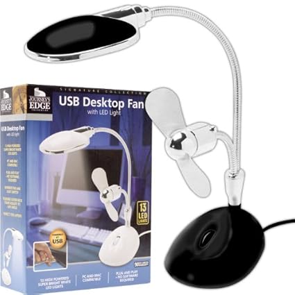 Journey's Edge 2 in 1 Laptop Desk LED Lamp and Fan - a very versatile product. two functions in one tool. Take your laptop anywhere and bring light and a gentle breeze with you with this astounding USB Desktop Fan with LED Light.Simply plugging this incredible device into your computer's USB port provides you with light and a cooling fan.The flexible goose necks for both the light and fan allow you to position them right where you need them.Don 't let light limit your mobility any longer with this amazing USB Desktop Fan with LED Light.